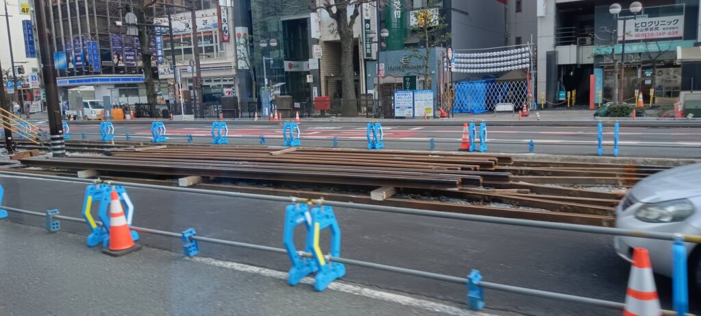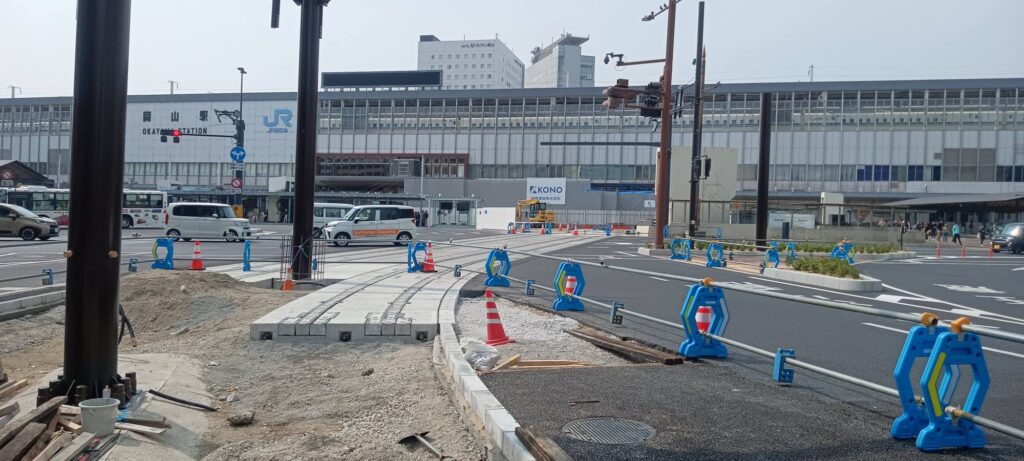 新着2026-0331  路面電車の岡山駅前広場乗入れ工事、現状。交差点部分にレールを引くコンクリートブロックが敷設され、架線柱も設置されている。仮電停までの間には、ダブルクロスポイントとレールも設置されている。いよいよ開業まで丸1年。なおハレノワへの路面電車環状化についても、詳細設計費用などが岡山市議会で可決された。撮影・松田和也